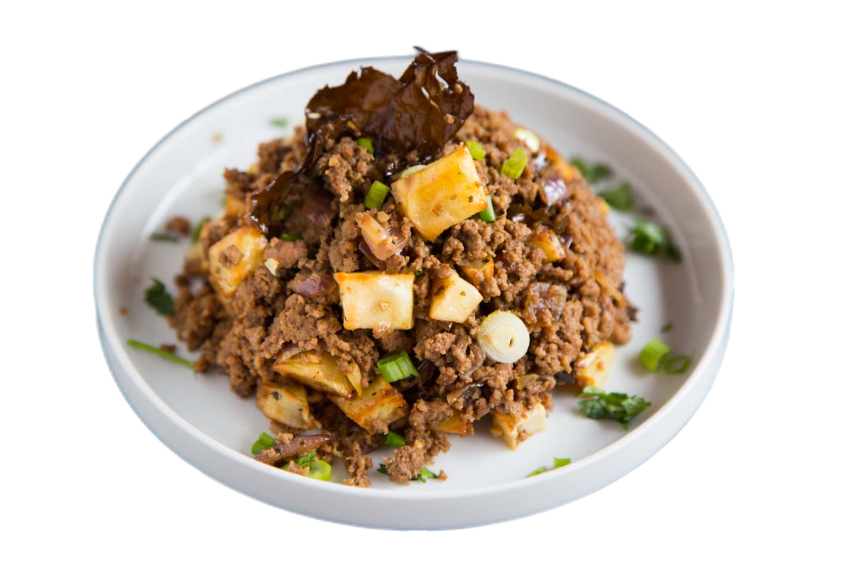Ground beef or pork seasoned with soy sauce and molasses with a fried egg on top